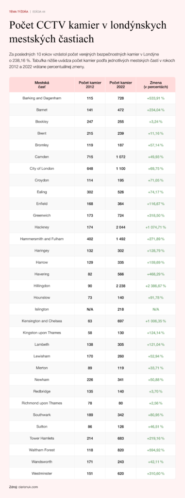 Londýn môže slúžiť ako ukážka európskej snahy o ešte rozsiahlejšie monitorovanie obyvateľstva. Nedávne odhady hovoria o viac než 942-tisíc bezpečnostných kamerách po celom meste, čo je približne jedna kamera na desať obyvateľov. Vo všeobecnosti sa v Spojenom kráľovstve nachádza štyri až päť miliónov bezpečnostných kamier, čo predstavuje približne jednu kameru na 11 až 14 ľudí.