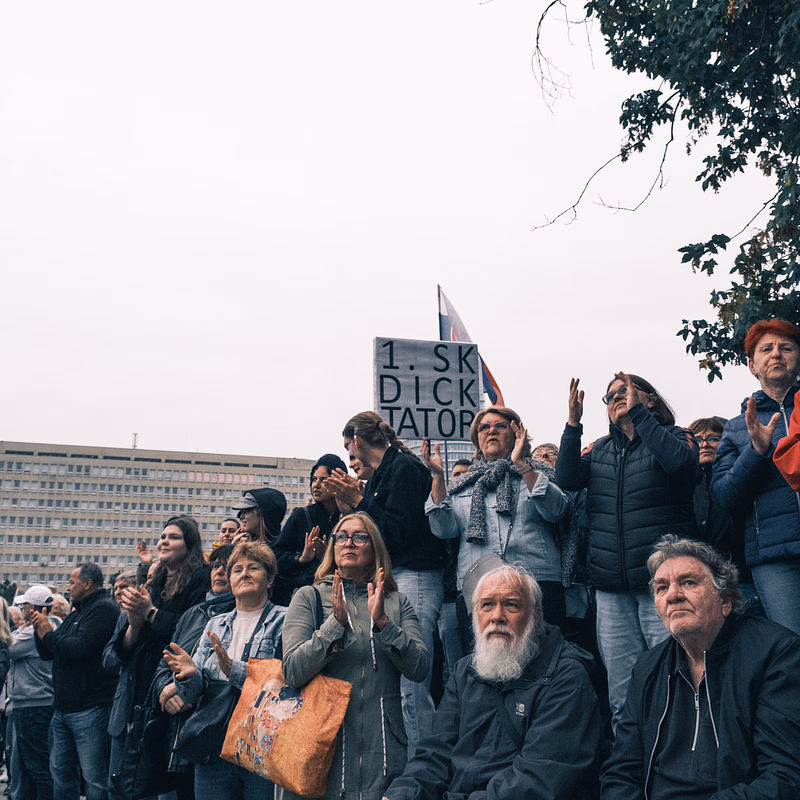 Protest na bratislavskom Námestí slobody sa začal hlasným pokrikmi "Vlastizradca" a "Dosť bolo Fica", dav sa pri tom prezentoval rapkáčmi, píšťalkami či trúbkami.