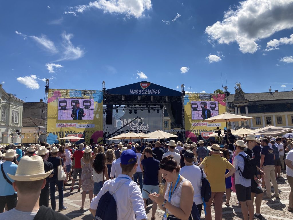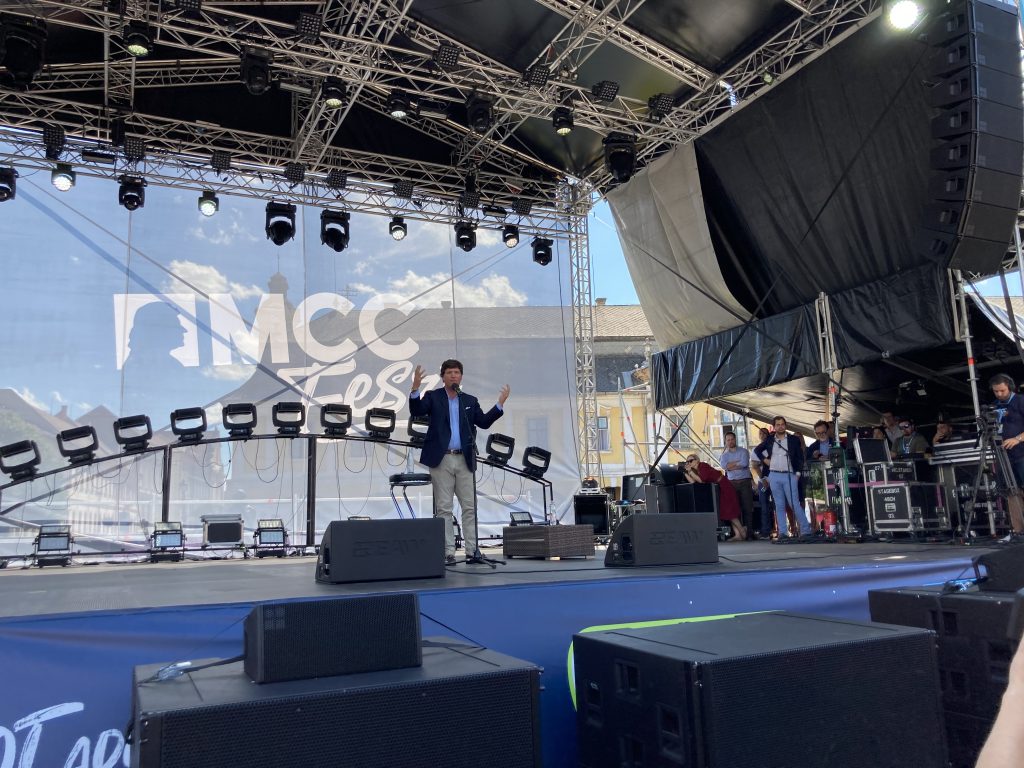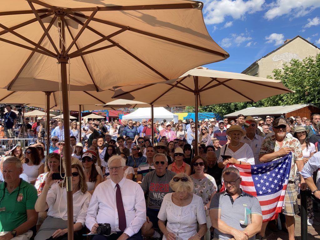 Sme pri reštaurácii s hotelom, na začiatku Széchenyi tér v centre Ostrihomu, 300 metrov od tribúny, kde o chvíľu americký komentátor vystúpi. Zhovárame sa s Rodom Dreherom, u nás už dobre známym americkým novinárom, ktorého spoznáte podľa zježenej štice a hrubého rámu okuliarov. Rod nám pred pár týždňami hovoril, ako mu volal Carlson, že chce prísť urobiť rozhovor s Orbánom, potreboval trochu poradiť. Už pár mesiacov je na pobyte v Budapešti. Dreher si Slovensko obľúbil, keď spoznal príbeh Tomislava Kolakoviča a našej tajnej cirkvi. Jeho knihu onedlho vydá v slovenskom preklade Postoj. Voľne debatíme, Dreher s úsmevom krúti hlavou nad ochrankou a čiernym autom s húkačkou, ktorá sprevádza Tuckera Carlsona. Keď konečne vyjde von, je uvoľnený, usmiaty, ochrankárov má síce viac ako náš premiér, ale bez problémov sa dáme do reči.