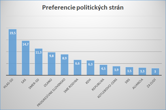 V prieskume preferencií volebných strán nasleduje strana SaS so ziskom 14,7 percenta a Smer-SD s 11,3 percenta. Matovičova strana by skončila tesne pod 10 percentami (9,8 percenta), progresívci získali 8,9 percenta, Sme rodina 6,6 percenta. Do parlamentu by sa dostalo ešte KDH s 6,3 percentami.