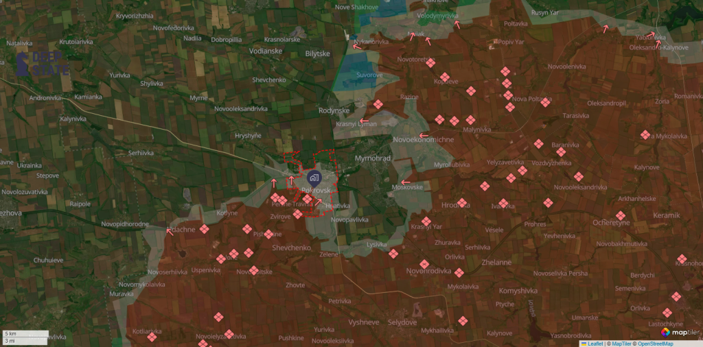 Kremeľ uviedol, že jeho jednotky za posledných 24 hodín dobyli v Pokrovsku 64 budov a odrazili ukrajinské útoky z Hryšina na západnom predmestí. Ruským jednotkám v oblasti navyše chýba už iba pár kilometrov, a dokončenie kliešťového útoku okolo Pokrovska a susedného Myrnohradu bude úspešné.