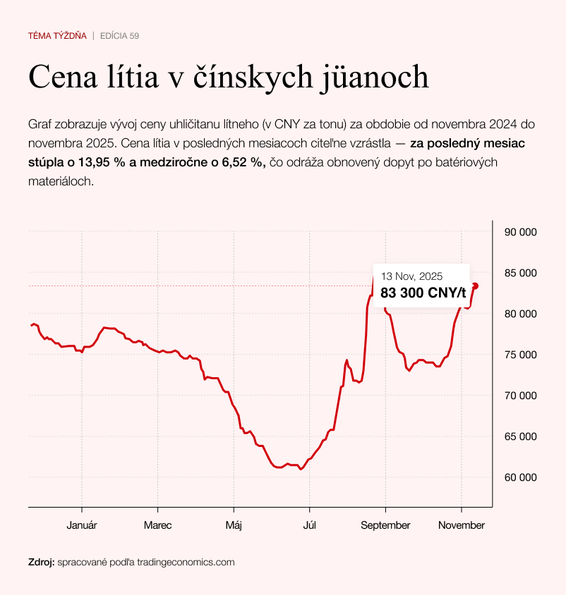 Pre bežného investora nie je rozhodujúca presná cena, ale skôr smer vývoja. Z aktuálnych dát vyplýva, že od konca septembra cena lítia znova rastie. Tento trend čiastočne kopíruje aj politický záujem Donalda Trumpa o suroviny strategického významu. Napriek tomu je cena lítia stále hlboko pod úrovňami z rokov 2022 až 2023, keď trh očakával jeho trvalý nedostatok, ktorý sa nakoniec nenaplnil.