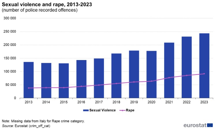 V roku 2023 sa na starom kontinente udialo 244-tisíc zaregistrovaných trestných činov sexuálneho násilia, z toho 91-tisíc znásilnení.