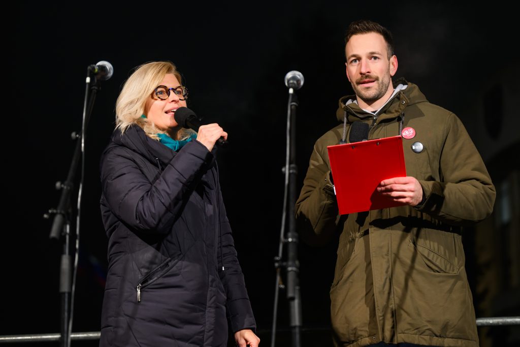 Moderátori Zuzana Wienk a Martin Suchý z pódia tvrdili, že vláda namiesto riešenia skutočných problémov oslabuje nezávislý úrad, ktorý chráni oznamovateľov korupcie a podľa ich slov „držal chrbát stovkám odvážnych“.