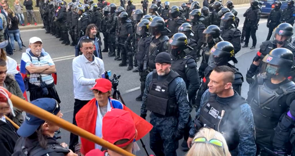 Neďaleko Dómu sv. Martina demonštrantov zastavil zásahový tím bratislavskej mestskej polície. K mestskej polícii sa neskôr pridala štátna polícia so svojimi policajnými ťažkoodencami. Protestujúci dav sa snažia dostať mimo cesty a zabrániť im pokračovať v blokácii ďalších ciest.