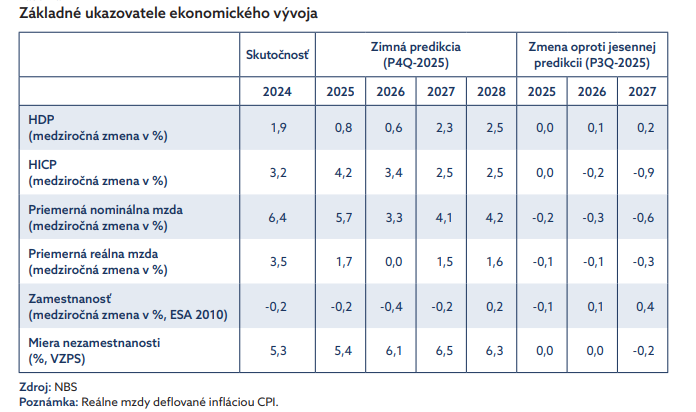 Slovenská ekonomika sa podľa regulátora nachádza „uprostred dvojročného cyklu veľmi slabého ekonomického rastu“. Kažimír upozorňuje, že v rokoch 2025 a 2026 sa rast hrubého domáceho produktu pohybuje približne na úrovni jedného percenta, pričom hospodárstvo čelí výraznému „protivetru“.
