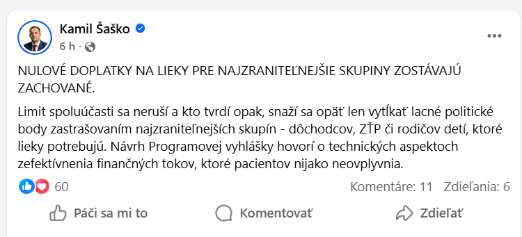 Ministerstvo zdravotníctva na naše otázky týkajúce sa zníženia ochrany limitov na doplatky liekov neodpovedalo. V stredu dopoludnia však minister Kamil Šaško uverejnil status o tom, že „nulové doplatky na lieky pre najzraniteľnejšie skupiny zostávajú zachované“.