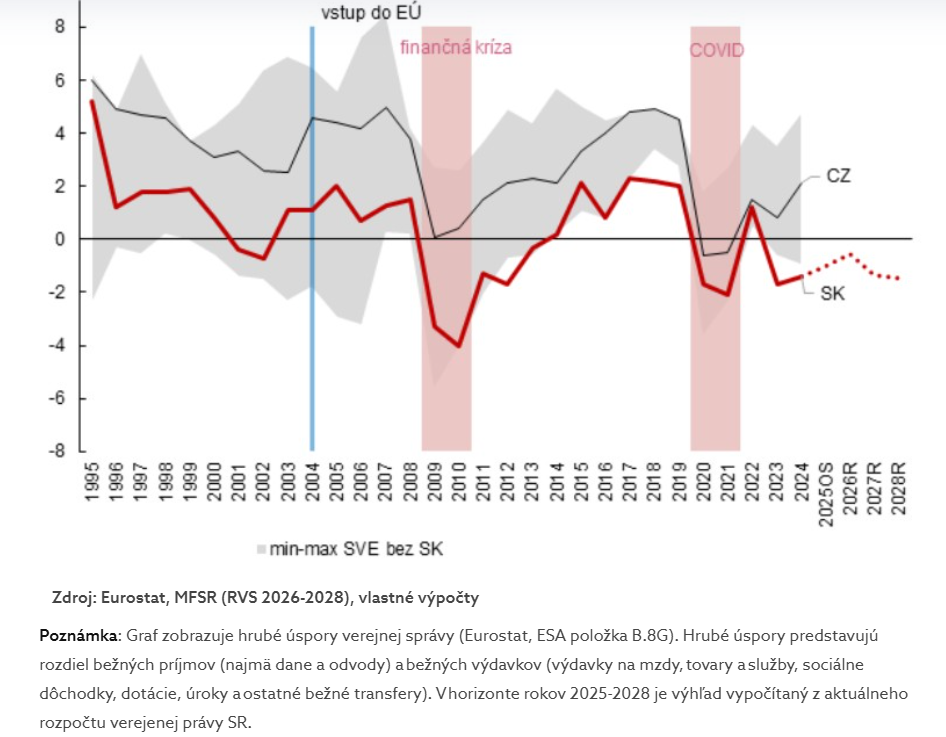 Bežné príjmy sotva pokrývajú bežné výdavky a takzvané hrubé úspory verejnej správy patria dlhodobo k najnižším v regióne. To výrazne obmedzuje schopnosť spolufinancovať investície či vytvárať vlastné investičné programy. V praxi to znamená, že bez externých zdrojov sa investičná aktivita štátu rýchlo dostáva do útlmu.