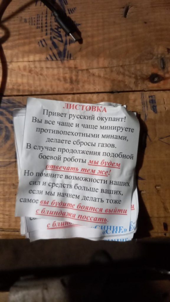 „Nazdar, ruský okupant! Čoraz častejšie a častejšie kladiete protipechotné míny, používate bojový plyn. V prípade, že budete v podobnej bojovej činnosti pokračovať, budeme odpovedať rovnako!“ uvádza sa na letáku v ruskom jazyku.