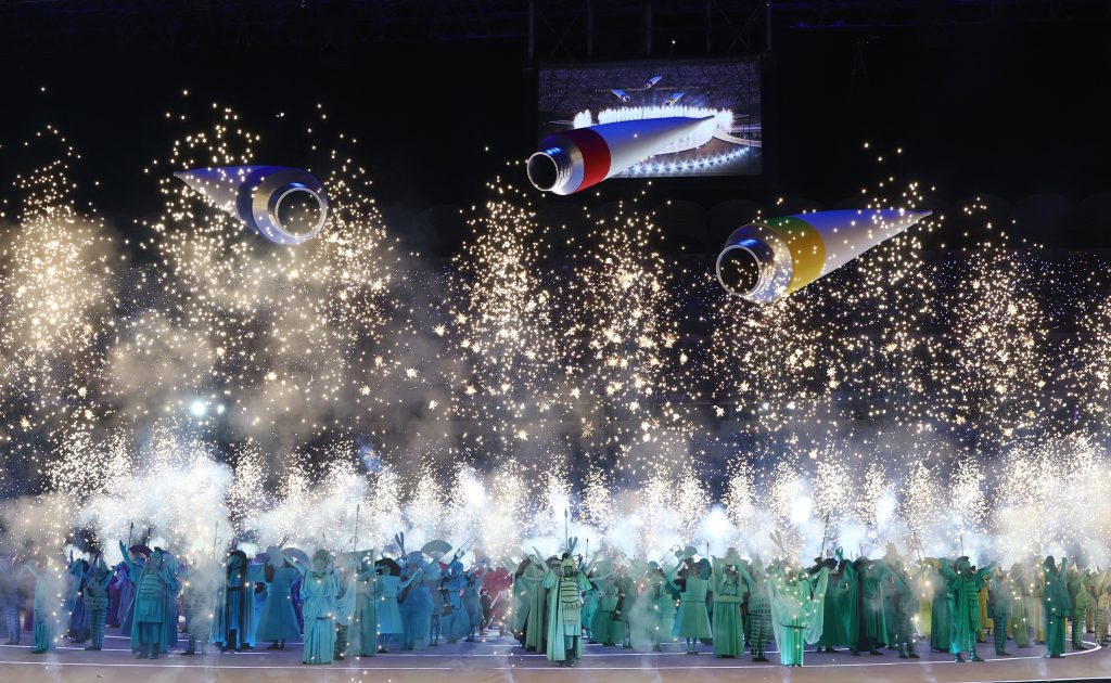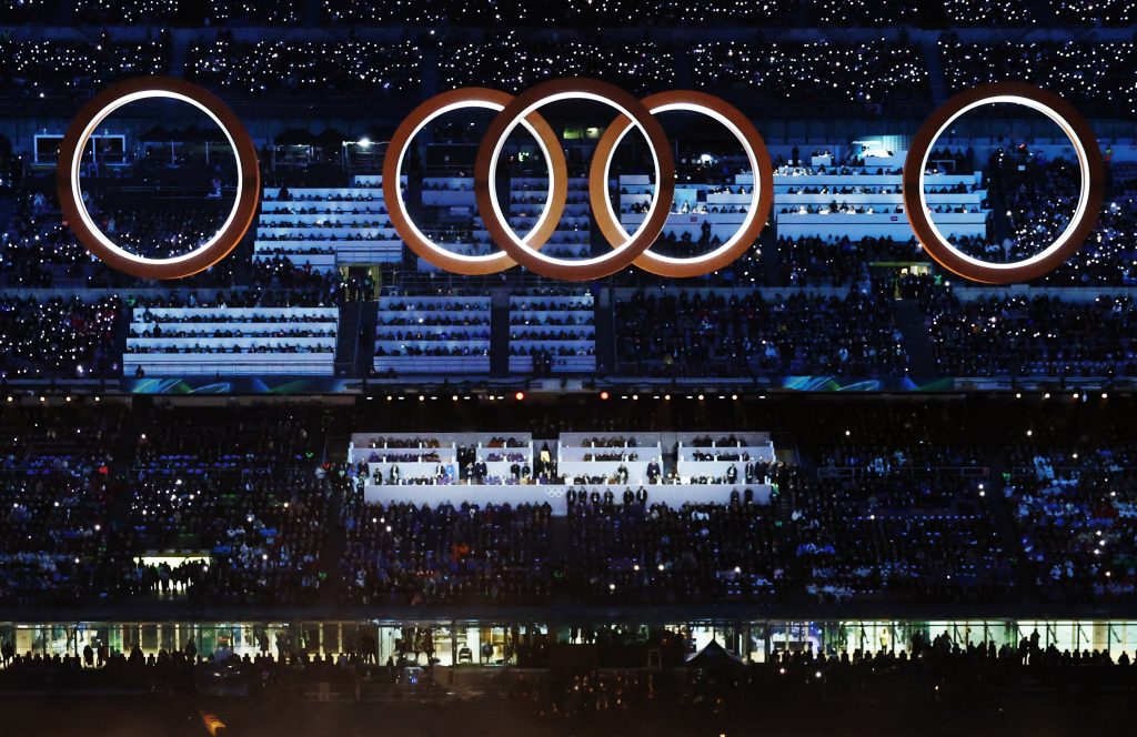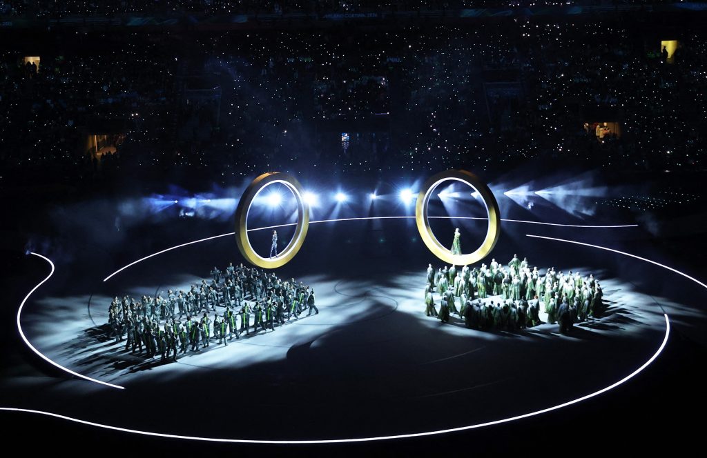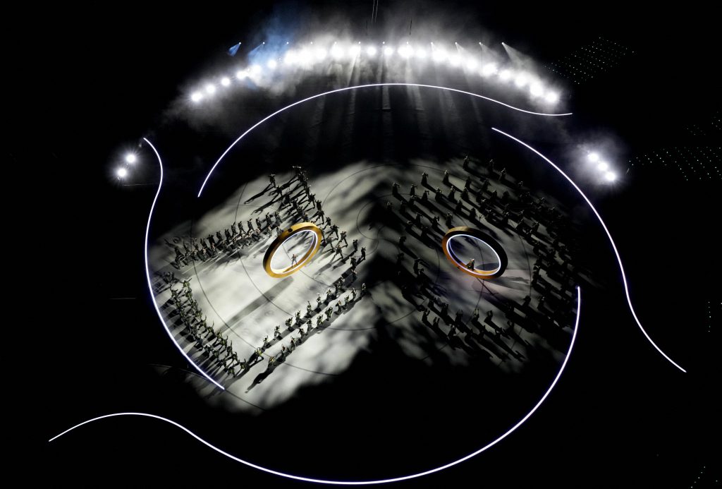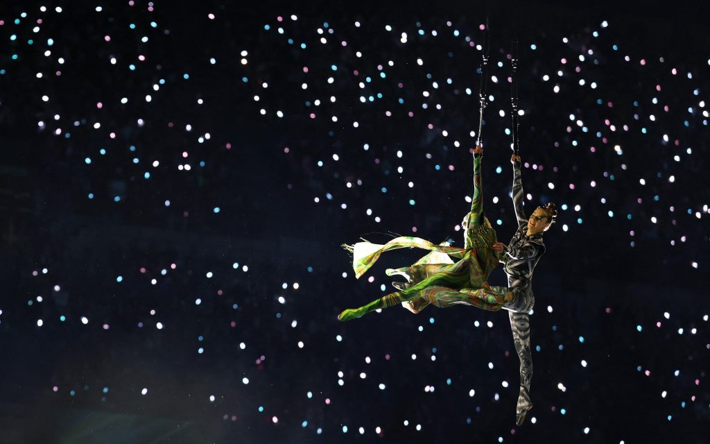 Umelci potom vyskočili z oboch kruhov a akrobatickým tancom sa spustili na zem. Medzitým na lanách organizátori spustili ďalšie tri kruhy, čím vytvorili symbol olympijských hier.