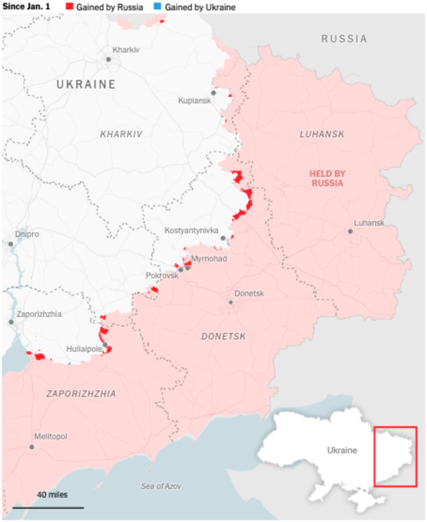 V Doneckej oblasti sa Ukrajina zamerala na obranu miest Pokrovsk a Myrnohrad, ktoré spolu mali pred vojnou viac ako 100-tisíc obyvateľov. Silné nasadenie vojakov spolu s modernou dronovou technológiou výrazne spomalilo ruské útoky.