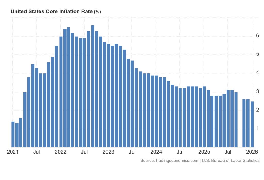 Absenciu príbehu potvrdili údaje o inflácii v USA za január 2026, ktoré sme sa dozvedeli koncom týždňa. Celková inflácia za január klesla na 2,4 percenta. Dvojpercentný inflačný cieľ je na dosah. Jadrová inflácia bez potravín a energií klesla na 2,5 percenta, čo je najnižšia hodnota od apríla 2021, keď sa začali inflačné problémy spôsobené zastavením hospodárskeho rastu počas covidu.