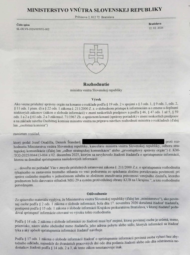 Zamietnutie rozkladu týkajúceho sa sprístupnenia informácií zo strany ministra vnútra. Zdroj: Denník Štandard