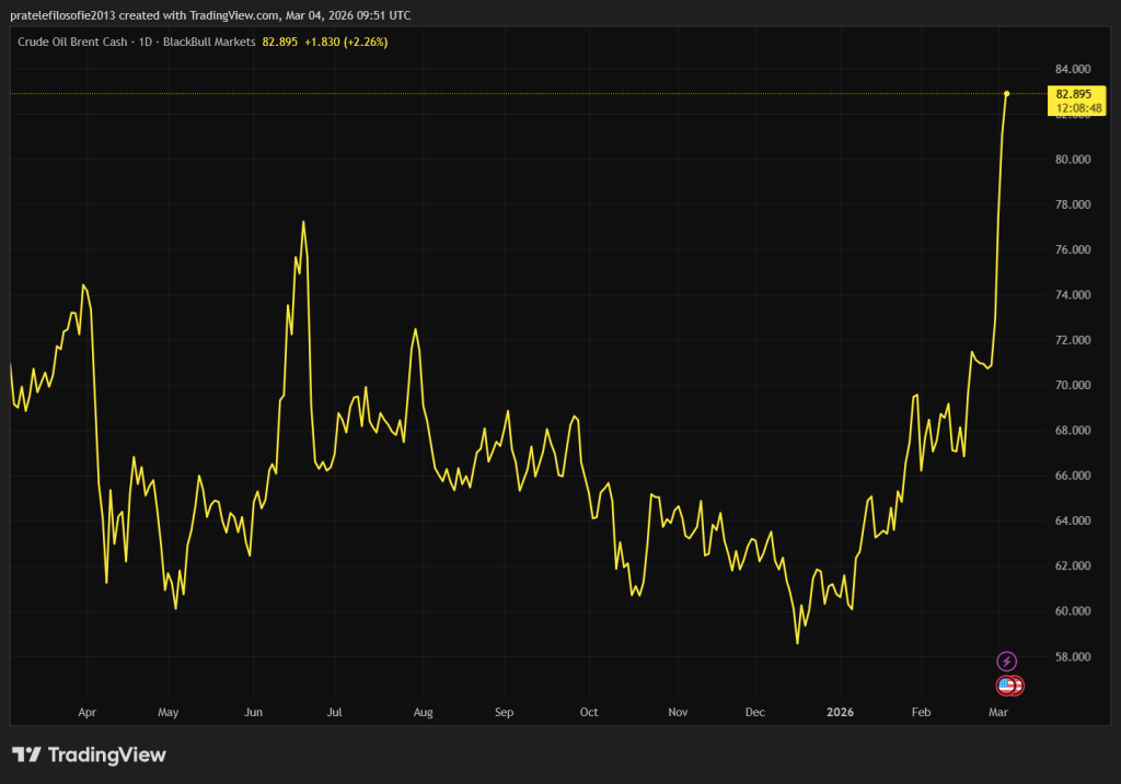 Keď sa pozrieme na graf vývoja severomorského Brentu, zistíme, že cena ropy od obdobia pred útokom na Irán vyskočila zo 70 dolárov na 82 dolárov za barel. To predstavuje zdraženie o zhruba 19 percent.