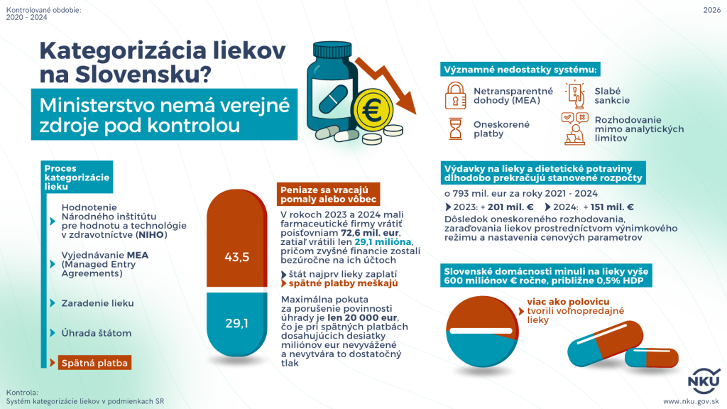 „Každý druhý liek je financovaný nad ekonomicky primeranou úrovňou. Finančný dosah týchto odchýlok je významný. Odhad dosahuje 244 až 356 miliónov eur vynaložených nad rámec nákladovej efektívnosti v päťročnom horizonte, ktoré mohli byť použité na iné terapie,“ konštatuje NKÚ.