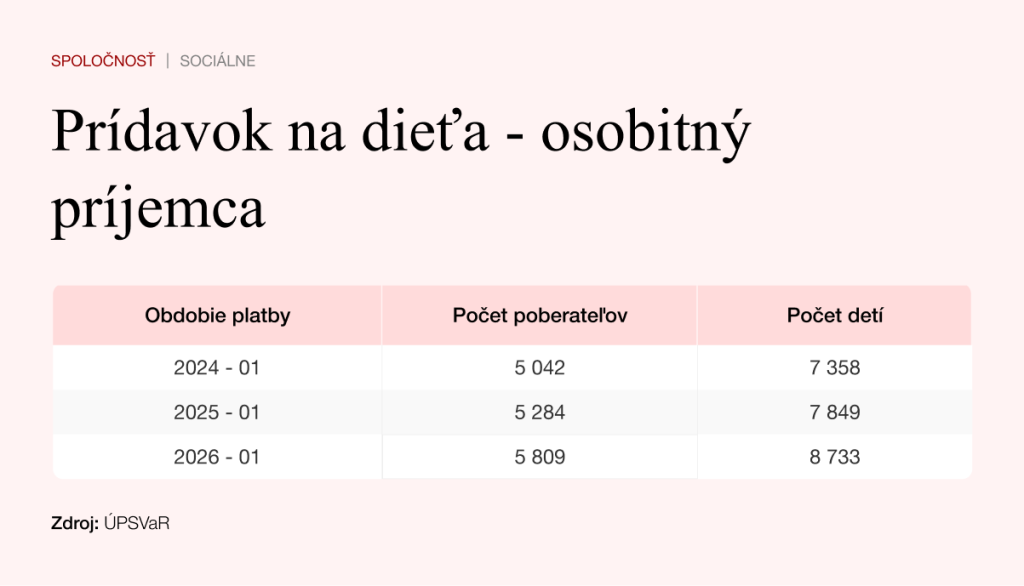 Ústredie práce, sociálnych vecí a rodiny informovalo Štandard, že do konca roka 2025 bolo pridelených 8 733 osobitných príjemcov. Znamená to o 900 detí viac ako rok predtým.