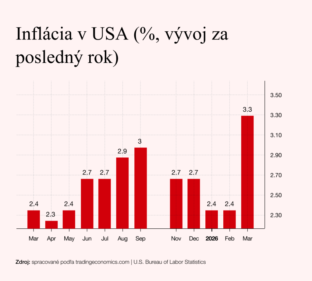 Inflácia síce rastie, ale zatiaľ nejde o nekontrolovaný rast, ale o vývoj presne podľa očakávaní. Napriek tomu americká inflácia v marci 2026 opäť nepríjemne prekvapila. Medziročne zrýchlila na 3,3 percenta, teda na najvyššiu úroveň od mája 2024, a to po dvoch predchádzajúcich mesiacoch, keď dosahovala 2,4 percenta.