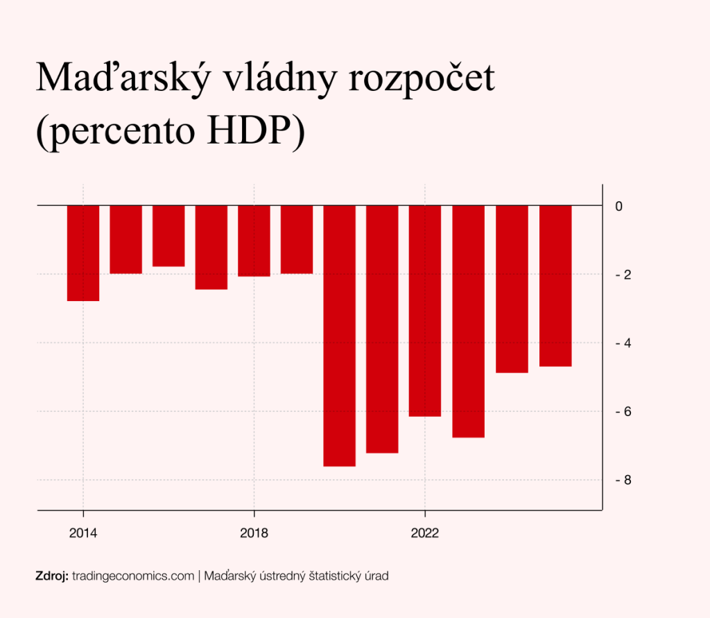 Zatiaľ čo v rokoch 2014 až 2019 sa Maďarsku darilo udržať deficit pohodlne pod maastrichtskými tromi percentami HDP, pandemický šok v roku 2020 vystrelil deficit na osem percent a odvtedy sa ho nedarí skrotiť. Aj v predvolebných rokoch 2024 a 2025 sa deficit tvrdohlavo držal na úrovni 4,5 percenta až päť percent HDP.