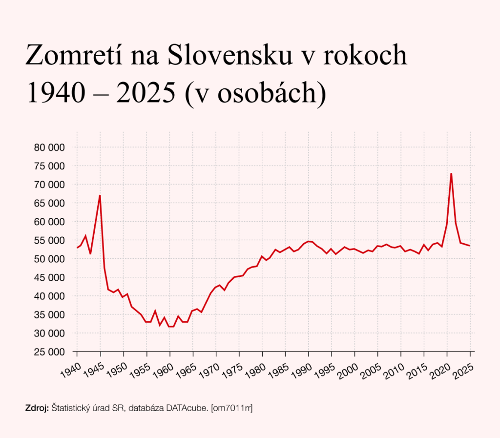 Úmrtnosť na Slovensku sa po období pandémie postupne ustálila. V roku 2025 zomrelo 53,5 tisíca ľudí, čo predstavuje najnižší počet od roku 2020 a zároveň hodnotu blízku dlhodobému priemeru z predchádzajúcich rokov.