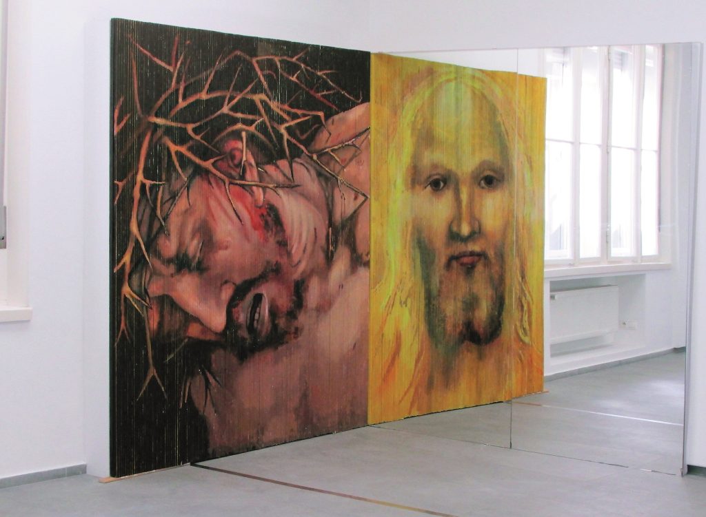 Mňa maľovanie bavilo od detstva a baví ma stále. Ale používam rôzne médiá vo vzťahu k tomu, čo chcem vyjadriť. Môže to byť plastika, video, objekt, rovnako ako maľba alebo fotografia. Mediálne sa nechcem vyhraňovať – aj profesorský titul mám v odbore intermediálne umenie. V tomto prípade som namaľoval tri portréty a pracoval s nimi v myšlienkovej línii, odvodenej z príkladu, ktorý použil rakúsky fyzik Erwin Schrödinger na ilustráciu určitých stavov v kvantovej fyzike. Pokúsil som sa aplikovať túto dichotómiu na portrét Alberta Einsteina, portrét Schrödingera a obraz umučeného a zmŕtvychvstalého Krista – citoval som expresívne portréty z Isenheimského oltára Matthiasa Grünewalda. Asi by bolo zbytočné opisovať tieto diela, lebo boli založené na priamom kontakte s divákom a na vizuálnom zážitku. Obraz, ktorý ste videli, sa v zrkadle javil celkom inak.