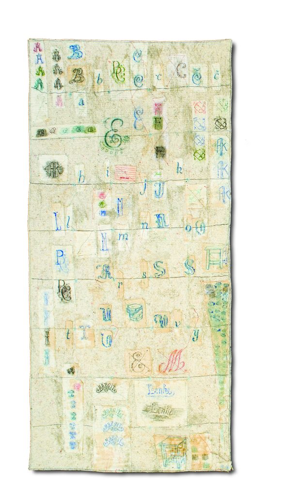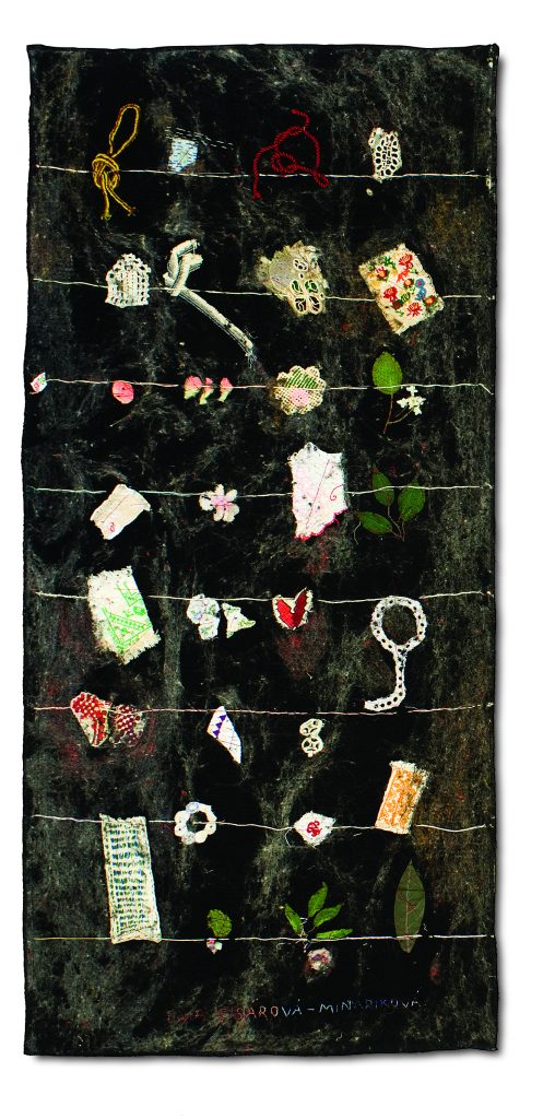 Vpravo: Kaligraficky zapisník VIII, 1997, plstený textil, netex, kolaž výšivkami, frotaž výšivkových iniciál. Majetok autorky. Foto: Martin Marenčin