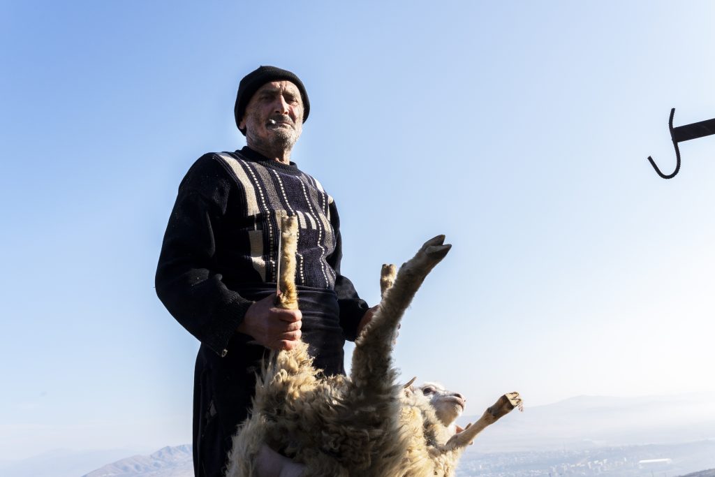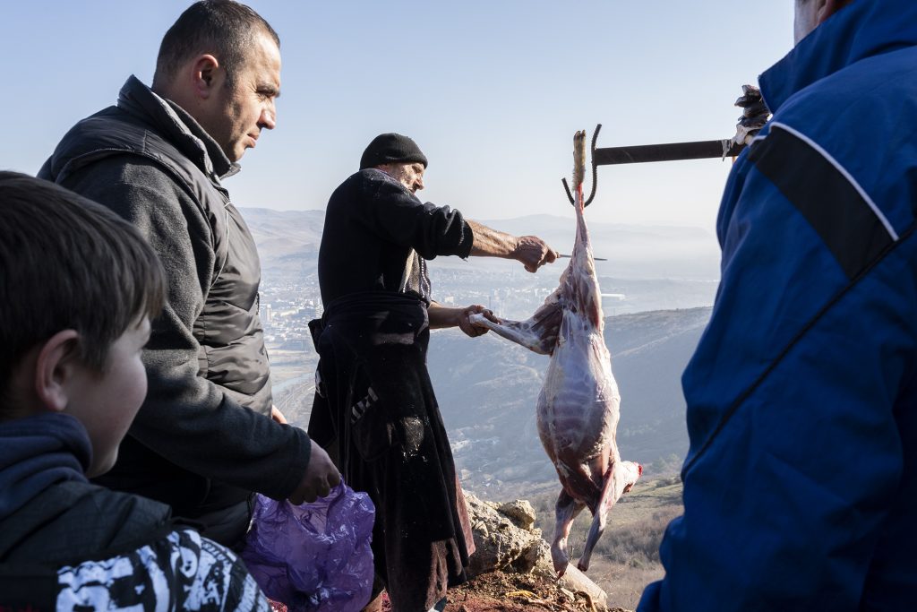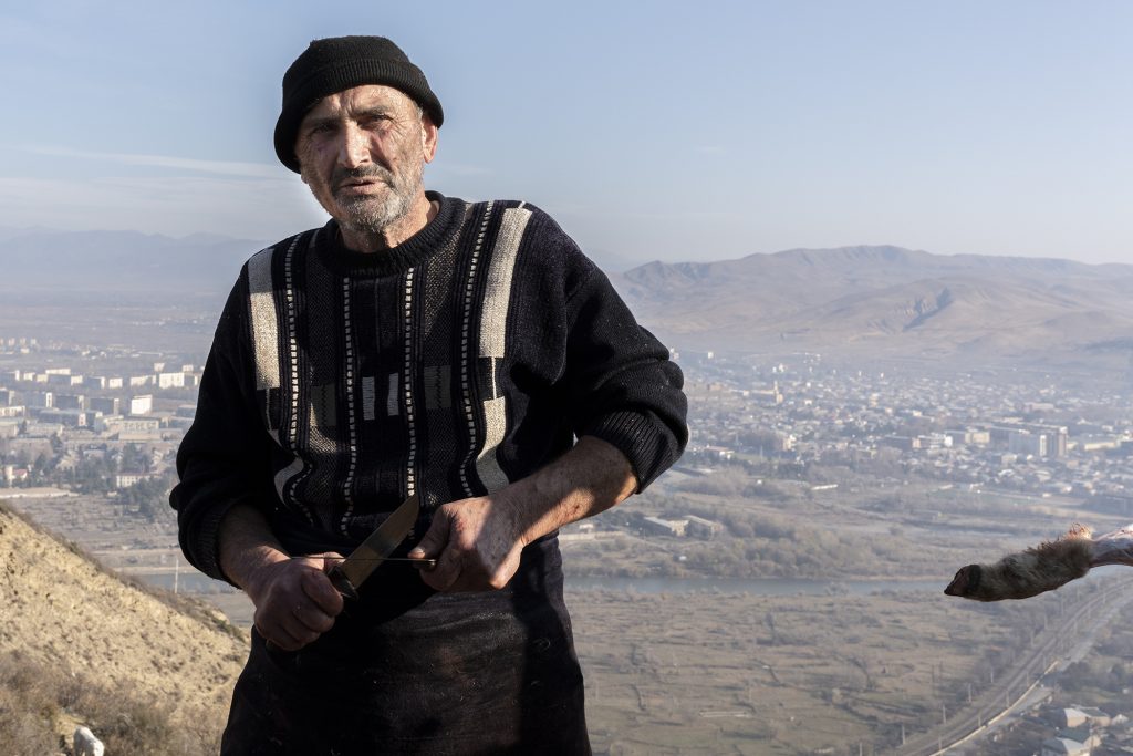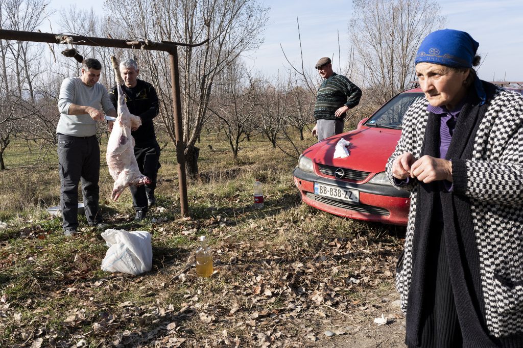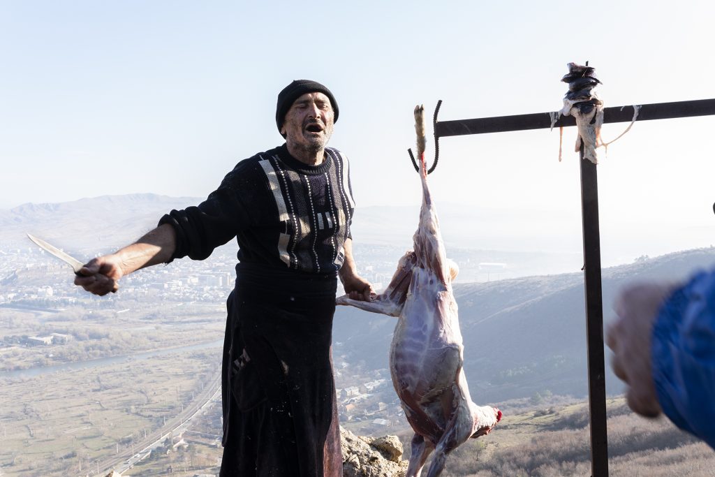 Medzitým sa k nám pridal aj náš taxikár Zurab, ktorý nás po jemu dobre známom okolí vozieva už niekoľko mesiacov. Ihneď som mu porozprával o neochote mladého dedinčana nechať sa fotiť pri práci. "Je to nelegálne? Veď tu dole o niekoľko metrov nižšie je policajná hliadka," opýtal som sa ho. "Ale kdeže. Po toľkých rokoch ešte nepoznáš povahu Gruzíncov? Dnes si tu pekne zarobí a zajtra sa pôjde predvádzať dole do mesta. Nepotrebuje, aby niekto na internete videl, že tu rezal barany. Ako keby sa bolo treba za poctivú prácu hanbiť. Ale u nás je to už tak," vysvetlil s chladom a priamosťou človeka, ktorý už raz v živote o všetko prišiel a na nič sa nehrá.