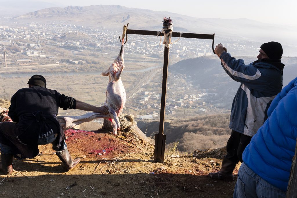 Počas Giorgobi sa spočiatku zdalo, že rovnaký scenár sa bude opakovať aj tam, že správy o hromadných obetách sú len legendami a spomienkami na časy dávno minulé. Krátko po odchode z chrámu smerom na hlavnú cestu nás opäť strhol dav pútnikov so zvieratami. Neodbočil však na cestu smerujúci dole z mesta, ale pokračoval rovno k miestu, ktoré sme pôvodne nezbadali. Len niekoľko metrov od cesty sa nad strmým úbočím týčili tri železné kríže. Na oboch koncoch každého z nich boli háky na na nich viseli barany. Našli sme miesto obety.