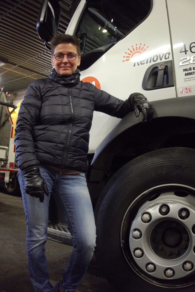 Ukáže mi odstavené smetiarske autá, spolu s kolegom deň čo deň zbiera organický a zvyškový odpad. „Dnes tam sedíš ako kráľ,“ povie, „všetko je automatické.“ Má rada túto prácu, hoci žien je v nej ako šafránu. Ak ešte obsluhujú, tak najčastejšie triediace žeriavy. „Smetiari majú silnú identitu, podobne ako značka Volvo, kde som začínala v devätnástich ako vodička vysokozdvižného vozíka.“ Hoci ju sledujú prostredníctvom GPS, váži si nadobudnutú slobodu, že si sama určuje prestávky a grafikon trasy. Mnohí, hoci nie väčšina z jej kolegov, sú prisťahovalci. To, že o nej bez uvedenia mena hovoril Putin, vie od ruskej predavačky v obchode, v ktorom nakupuje.