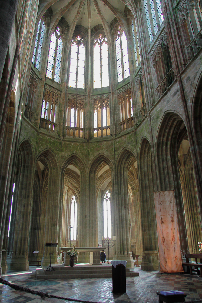 V 11. storočí benediktíni prijali neuveriteľný plán: vztýčiť na vrchole Hory kostol dlhý osemdesiat metrov. Keďže priestor na vrchole ostrova bol obzvlášť úzky, bolo najprv potrebné na vrchole skaly vystavať rovnú plošinu. Geniálni stavitelia preto po okrajoch skaly vztýčili mohutné krypty, čím vznikla robustná základňa v tvare latinského kríža. Stavba tohto kolosálneho a majstrovského diela trvala viac než šesťdesiat rokov.
