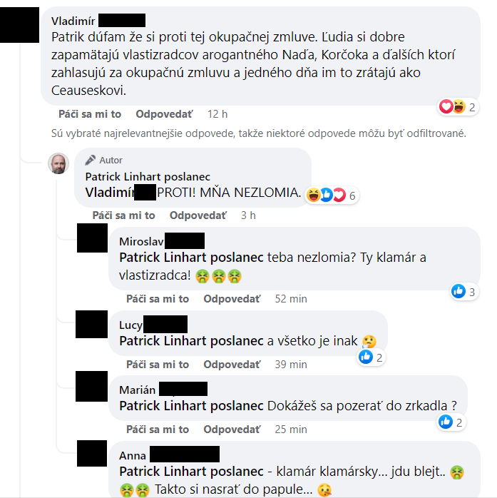 „Toto je dôkaz, ako nechutne sa korumpovalo a vydieralo. Patrik Linhart zo Sme rodina, ktorý sa ešte včera zastrájal, že jeho nezlomia a že bude hlasovať proti, dnes hlasoval za,“ napísal na margo názorového kotrmelca analytik Eduard Chmelár, hoci nesprávne uviedol, že Linhart svoj komentár písal včera, teda v utorok.