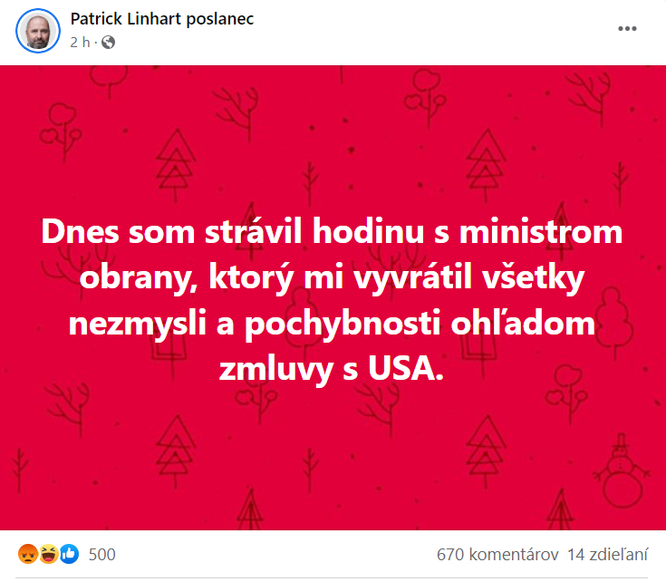 „Dnes som strávil hodinu s ministrom obrany, ktorý mi vyvrátil všetky nezmysli a pochybnosti ohľadom zmluvy s USA,“ napísal Linhart s pravopisnou chybou v stredu o 11:12, teda len niekoľko minút pred tým, ako zahlasoval za vojenskú dohodu.