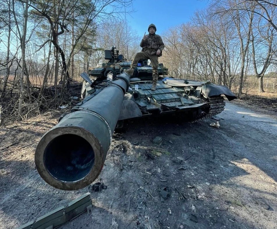 Ukrajinský vojak na zničenom ruskom tanku. Foto: Internet