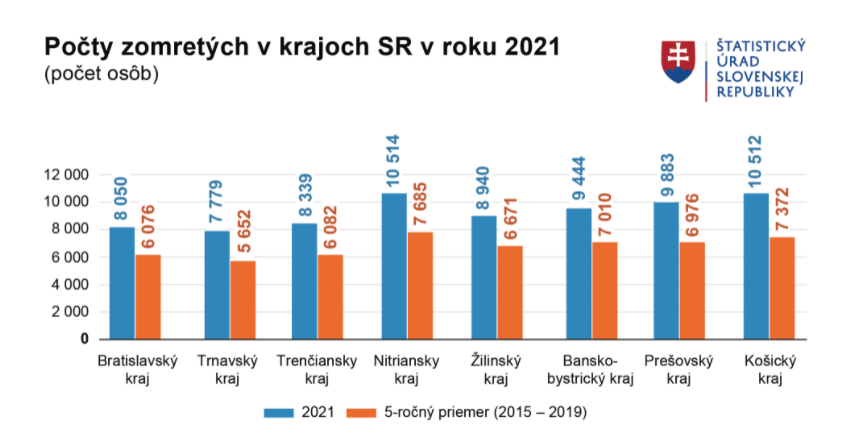 Z pohľadu regiónov sa extrémne vysoké prírastky počtu zomretých prejavili najmä v prvom štvrťroku a potom v posledných dvoch mesiacoch minulého roka. Nadúmrtnosť sa zaznamenala vo všetkých regiónoch, v troch z ôsmich krajov mala vyššiu hodnotu ako v priemere za celé Slovensko.