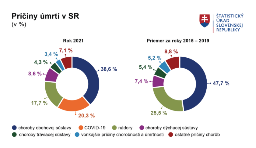 „Pandémia COVID-19 spôsobila výrazné zvýšenie mier úmrtnosti na Slovensku, už v roku 2020 prekročil počet zomretých hodnotu tisíc úmrtí na 100-tisíc obyvateľov a v roku 2021 sa zvýšil až na 1 350. Ide naozaj o najvyššiu hrubú mieru úmrtnosti v povojnovej histórii Slovenska,“ spresnila Zuzana Podmanická, riaditeľka odboru štatistiky obyvateľstva ŠÚ SR.