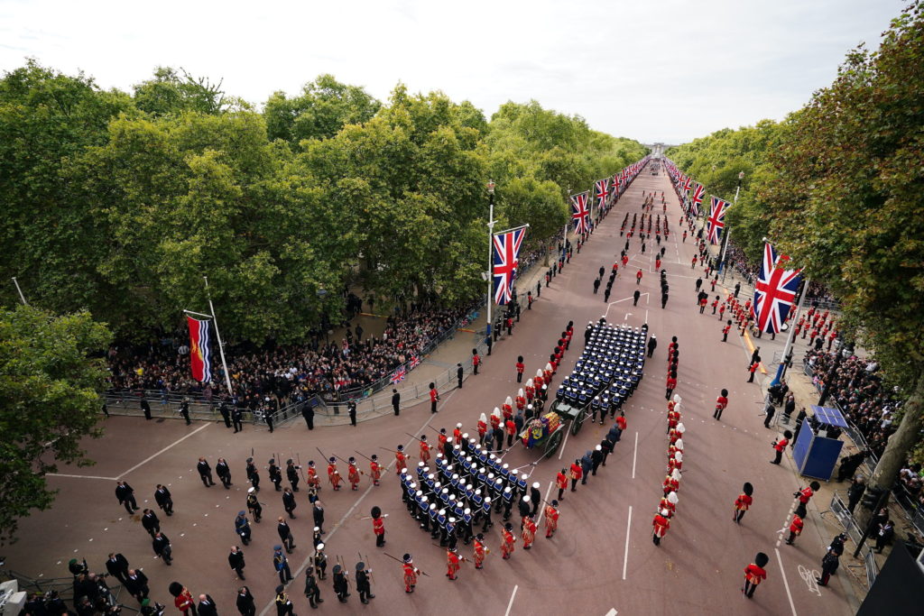 Kráľovská kanadská jazdná polícia vedie sprievod, ktorý pozostáva z príslušníkov ozbrojených síl Spojeného kráľovstva a Spoločenstva národov, policajtov a Národnej zdravotnej služby. Za lafetou s rakvou kráčajú kráľ Karol III. a ďalší členovia kráľovskej rodiny. Procesiu, ktorej trasu lemujú príslušníci ozbrojených síl a polície, sprevádza zvuk zvonu Big Ben a salvy zo zbraní.