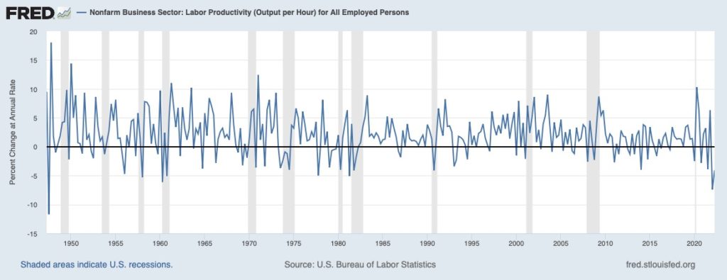 Produktivita, definovaná ako výstup za hodinu, bola revidovaná mierne nahor a v druhom štvrťroku 2022 klesla o 4,1 percenta. Stále to predstavuje 2,4-percentný pokles v porovnaní s rovnakým štvrťrokom minulého roka a je to najväčší pokles od začiatku série v roku 1948. Keď sa produktivita znížila o podobné hodnoty, v roku 1974 a na začiatku 80. rokov nastali recesie – posledné obdobie v USA v stagflácii (pozri graf nižšie).