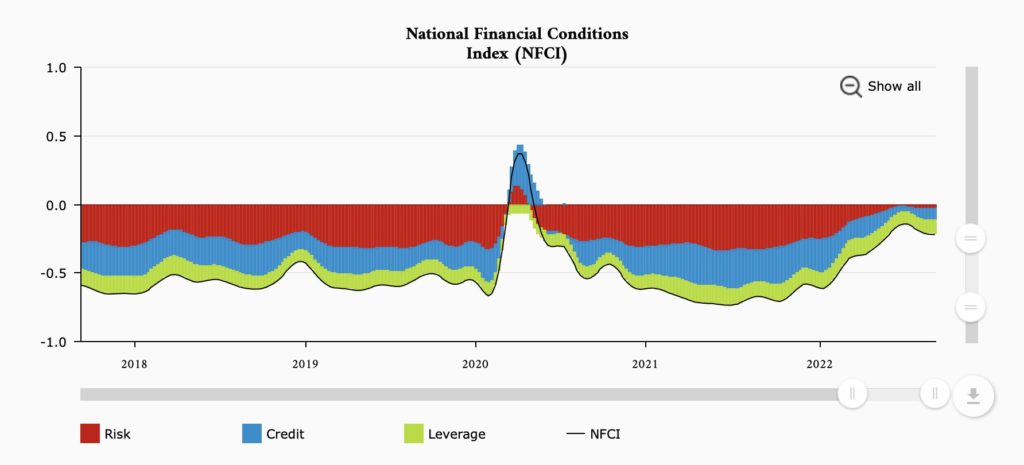 Finančné podmienky sa začali vyrovnávať po ich uvoľnení na konci júla podľa indexu národných finančných podmienok chicagského FED-u (NFCI) (pozri graf 4). Očakávame, že NFCI bude v októbri pokračovať v sprísňovaní. NFCI zvažuje riziko, úvery a pákový efekt pri určovaní finančných podmienok na peňažných trhoch, dlhových a akciových trhoch a tradičných a „tieňových“ bankových systémoch. Kladné hodnoty NFCI indikujú podmienky sprísnenia a záporné hodnoty indikujú podmienky uvoľnenia.