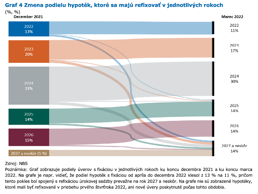 Deje sa to v prostredí cválajúcej inflácie a prichádzajúcej recesie. Výzvy na fixovanie úrokov na hypotékach nepadali vždy do pozorných uší. Údaje z marca 2021 z Národnej banky Slovenska ukazovali, že väčšinu slovenských hypoték čakala zmena (rozumej výrazný rast) úrokov v priebehu nasledujúcich dvoch rokov (2023, 2024). Tento podiel pokračujúcim procesom refinancovania a refixácie hypoték dodnes ešte zrejme o niečo klesol, ale aj tak bude zásadný.