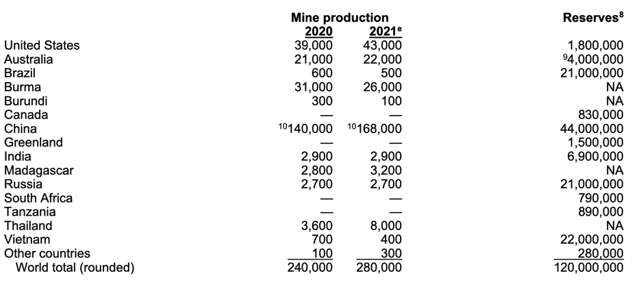 Podľa najnovších odhadov US Geological Survey sa Čína v súčasnosti podieľa na 60 percentách celosvetovej ťažby a vlastní cca 37 percent celosvetových zásob (obrázok 2). Čína má takmer úplnú dominanciu aj v spracovaní vzácnych zemín. V roku 2020 vyrábala cca 85 percent oxidov vzácnych zemín a cca 90 percent kovov, zliatin a permanentných magnetov zo vzácnych zemín.