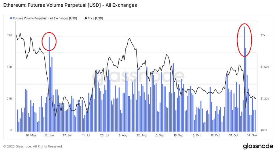 Nedávne zrútenie trhu sa kladne prejavilo na reťazci, keďže objem perpetuálnych futuritných kontraktov etherea voči doláru dosiahol nové ročné maximá. Najmä 8. novembra bol zaznamenaný celkový objem futuritných kontraktov v hodnote 79 miliárd dolárov, čím sa prekonalo 76 miliárd dolárov z 13. júna a 55 miliárd dolárov z 11. mája. Všetky tieto udalosti sa vyznačovali zvýšenou úrovňou nútených predajov, ktoré v konečnom dôsledku resetovali štruktúru trhu, keďže došlo k vyplaveniu prebytočnej finančnej páky. Pri bližšom pohľade sa objemy perpetuálnych futuritných kontraktov stabilizovali spolu s cenou v dňoch a týždňoch nasledujúcich po historických nárastoch objemu futuritných kontraktov.