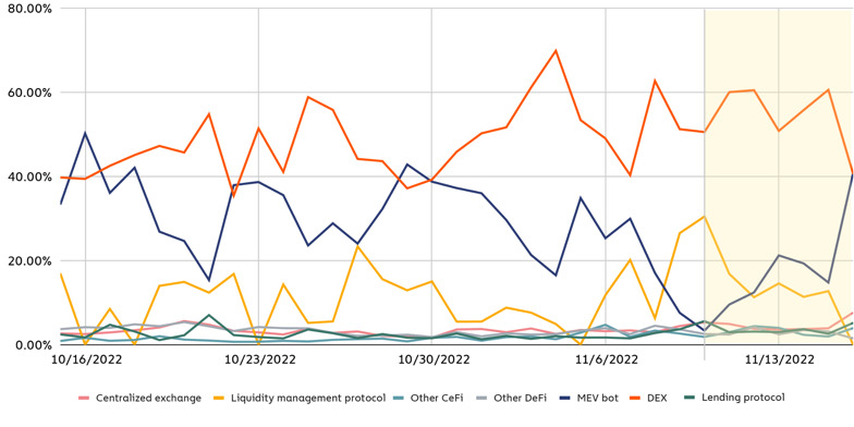Po udalostiach na burze FTX ceny v kryptoekonomike odrážajú hlbšie zníženie ďalej na rizikovej krivke v sektoroch infraštruktúry a zábavy. Tokeny DeFi aplikácií klesli aj napriek výmene tokenov za fiat meny (off ramping) na centralizovaných burzách (CEX), keďže otvorený záujem padol na najnižšiu úroveň za posledné dva roky a vyhliadky na rast búrz sa presúvajú na centralizované burzy, ktoré zavádzajú decentralizované kontrolné systémy. Nárast aktivity DeFi na reťazci po masívnom off rampingu z centralizovanej úschovy bol v skutočnosti výsledkom arbitrážneho náporu MEV botov na transakcie.