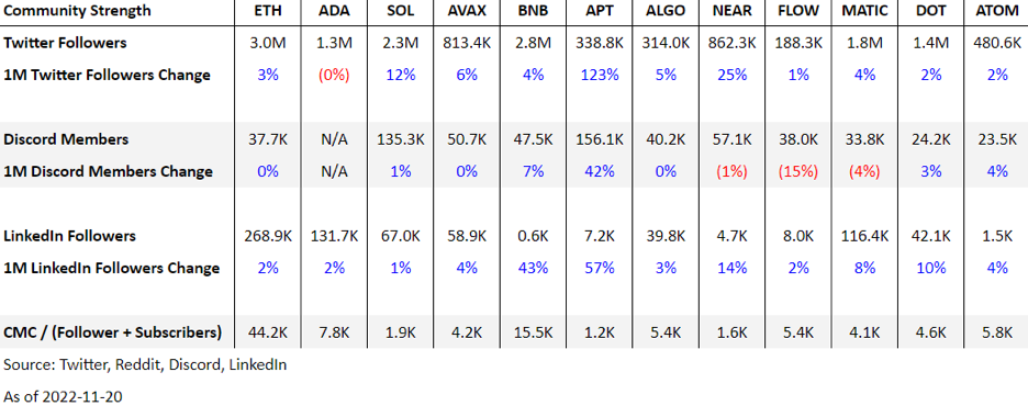 Rast komunity meraný prostredníctvom účtov na sociálnych sieťach sa zvyšuje v celom sektore, na rozdiel od aktivity pozorovanej priamo v reťazci. To dáva do súvislosti rastúci dopyt po nových a inovatívnych decentralizovaných riešeniach, ktoré ešte nie sú k dispozícii a z ktorých mnohé sú už vo vývoji napriek klesajúcej aktivite DeFi v dôsledku trhových podmienok.