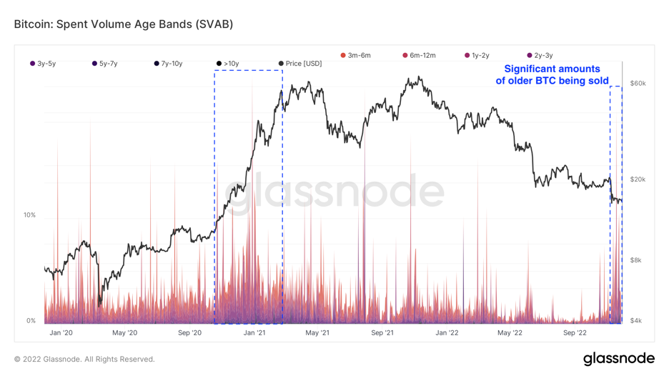 Vyššie uvedený graf SVAB znázorňuje predaj mincí vo veku od troch mesiacov do desiatich rokov rozdelený do rôznych intervalov. Veľké nárasty CDD možno pozorovať počas udalostí typu čierna labuť alebo počas extrémnych trhových operácií – ako napríklad veľké nárasty, ktoré sa vyskytli počas začiatku býčej rely v januári 2021. Počas tohto obdobia sa na trh dostalo veľké množstvo starších mincí, ktoré sa predali so ziskom. Naopak, počas extrémne medvedích období – keď je presvedčenie trhu najnižšie a investori predávajú zo strachu – možno podobné pozorovania zaznamenať aj v prípade metriky SVAB. Minulý mesiac bolo zrejmé, že kolaps FTX prinútil mnohých predať alebo presunúť svoje BTC, čo dokazuje nedávny nárast metriky CDD na grafe vyššie. Staršie mince uvádzané na trh predstavujú ďalší predajný tlak na už aj tak medveďom trhu a v najbližších dňoch by mohli spôsobiť pokles ceny BTC.