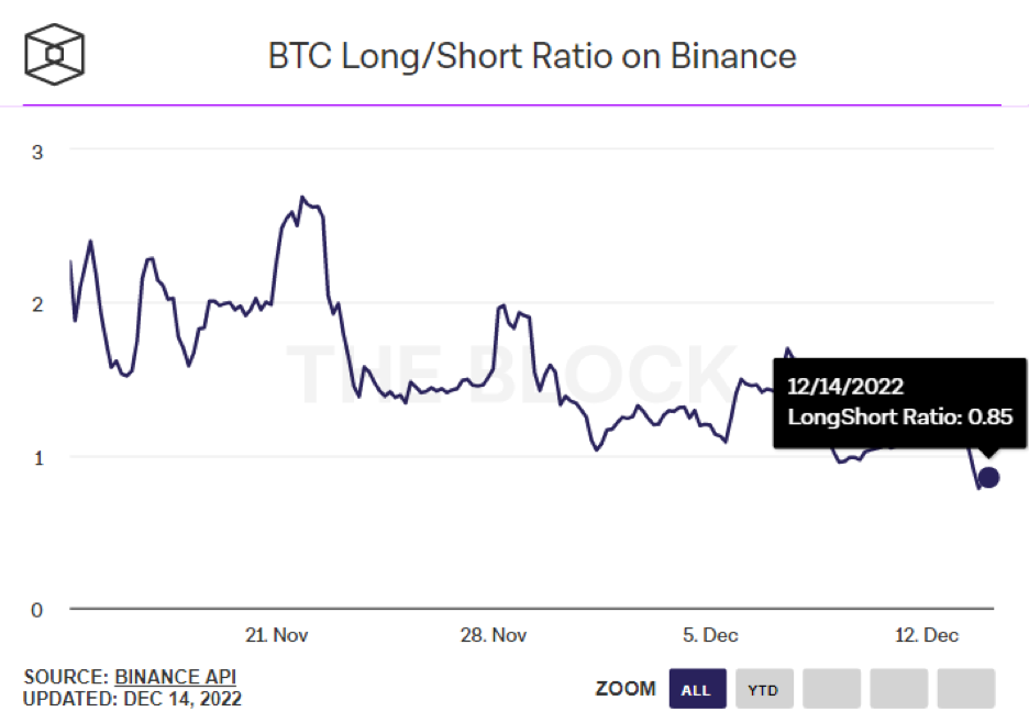 Burza CME zaznamenala zvýšené objemy a úrovne otvoreného záujmu počas krachu FTX začiatkom novembra. Odvtedy zostal otvorený záujem futuritných kontraktov bitcoinu stabilný, pričom sa mierne znížil z 30-dňového maxima 14 439 kontraktov BTC 8. novembra na 14 110 kontraktov 14. decembra. Všetky údaje naznačujú, že obchodníci na burze CME výrazne shortujú bitcoin, keďže termínová štruktúra futuritných kontraktov zostáva v backwardácii (cena futuritných kontraktov je nižšia ako očakávaná realizačná cena pri konci splatnosti).