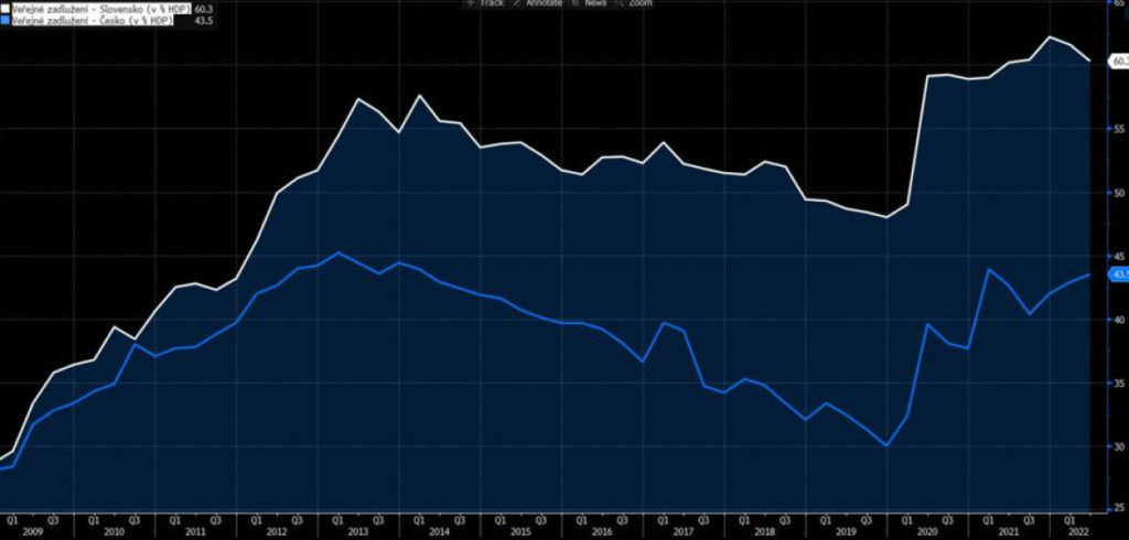 Pritom rast oboch krajín po vstupe do EÚ je porovnateľný. Slováci však museli pre jeho dosiahnutie siahnuť hlbšie do dlhu. Dlh sa Slovákom zvýšil od prvého celého roka v EÚ, teda od roku 2005, až do predvlaňajška z 34,7 percenta HDP na 63,1 percenta HDP. Teda o zhruba 28 percentuálnych bodov. Česku narástol za rovnakú dobu z 27,7 na 42 percent HDP, teda len o zhruba 14 percentuálnych bodov. Čiže len o polovicu slovenského nárastu.