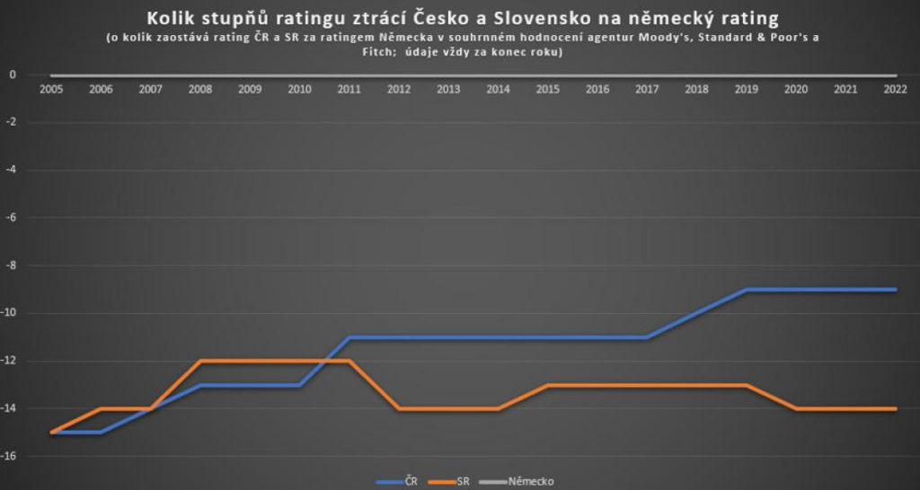 Česko teraz zaostáva za Nemeckom o deväť stupňov, pretože v hodnotení každej z troch uvedených agentúr majú jeho dlhopisy o tri stupne horšie hodnotenie ako nemecké dlhopisy. Slovenské dlhopisy však za tými nemeckými zaostávajú hneď o štrnásť stupňov. Pritom v rokoch 2006 až 2010 Slovensko vykazovalo prevažne lepší súhrnný rating ako Česko. Strácalo vtedy na Nemecko menej ako Česko.