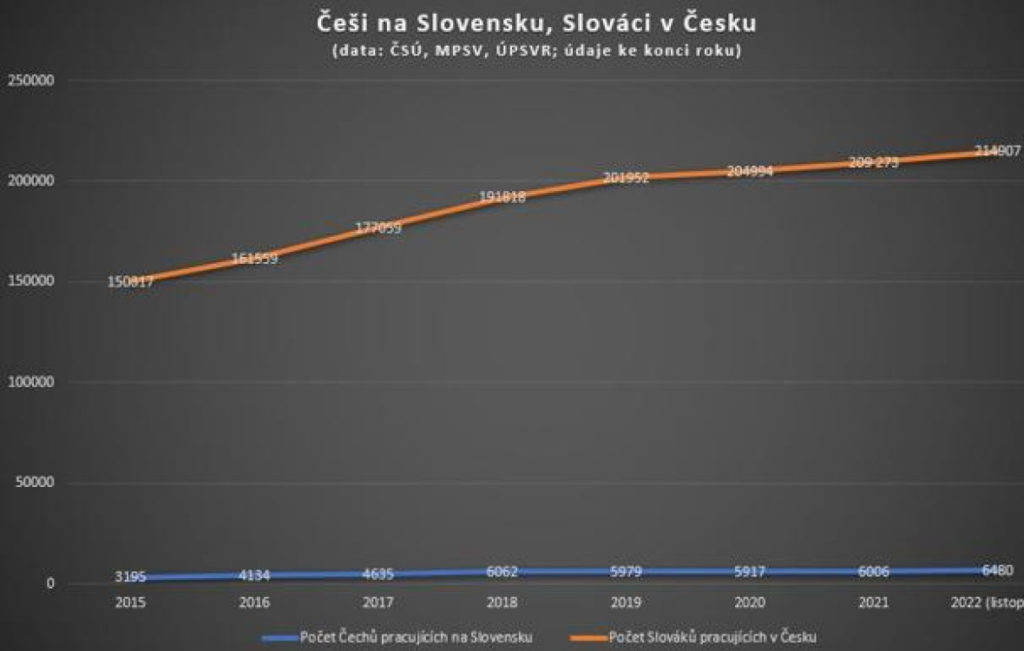 Za rovnaké obdobie sa počet Čechov pracujúcich na Slovensku zvýšil z 1 915 na 6 480 osôb, vyplýva z údajov slovenského Ústredia práce, sociálnych vecí a rodiny. Zatiaľ čo teda počet Slovákov pracujúcich v ČR od roku 2009 vzrástol o 114 684 osôb, počet Čechov pracujúcich na Slovensku sa zvýšil len o 4 565 osôb, je to teda približne 25-krát menej. Aj keď sa zohľadní zhruba polovičná veľkosť slovenského trhu práce v porovnaní s tým českým, je rozdiel stále markantný.