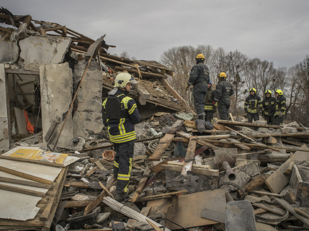Na úsvite v hlavnom meste Kyjeve sa na oblohe vznášali stopy po raketách alebo zbraniach protivzdušnej obrany a úlomky z úspešných zásahov padali na detské ihrisko a na rodinné domy.