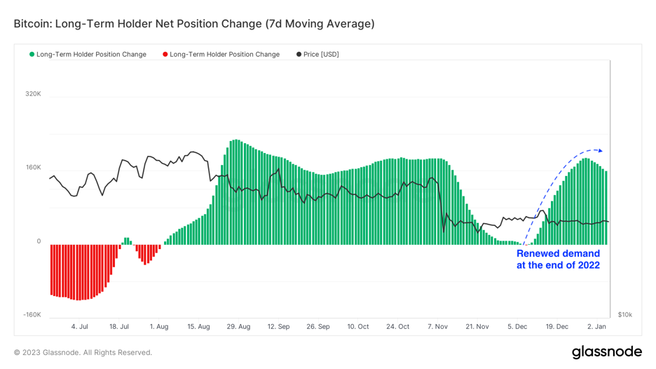 Počas relatívne krátkej histórie bitcoinu zaznamenali dlhodobí držitelia ako trieda mnoho úspechov. Dlhodobí držitelia vo všeobecnosti dobre načasovali cykly, predávali počas silných trhov a akumulovali počas poklesov. Z tohto dôvodu mnohí analytici a odborníci označujú dlhodobých držiteľov BTC v kryptopriestore za tzv. inteligentné peniaze (inštitucionálni investori). Preto pozorným sledovaním správania sa dlhodobých držiteľov na reťazci sa dá pridať ďalší kontext k súčasnému trhu. Rok 2022 bol náročný na mnohých frontoch, pričom rizikové aktíva znášali najviac ťažkostí v dôsledku zložitého makroprostredia. Cena bitcoinu sa počas roka znižovala a ustálila sa v súčasnom rozpätí 15 000 až 20 000 dolárov. Akumulácia sa prudko zvýšila krátko pred koncom roka, hoci sa zdalo, že po neúspechu FTX v polovici novembra 2022 došlo k miernemu poklesu dopytu.