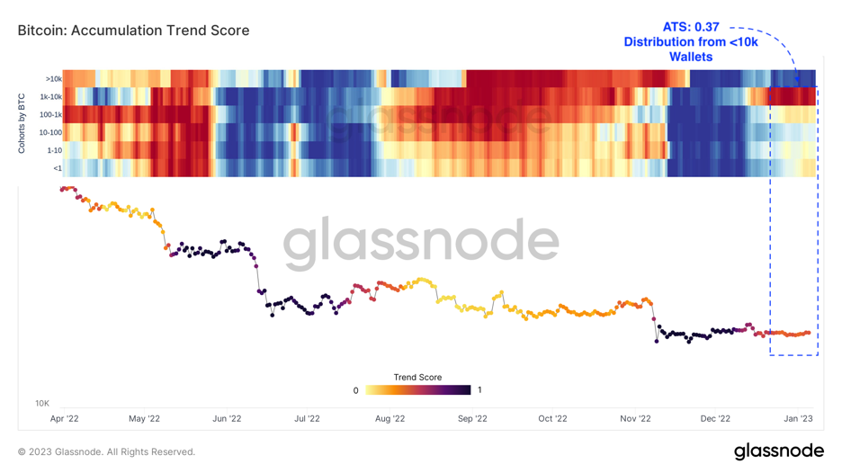 V súčasnosti sa trh posunul od silnej akumulácie (nákup BTC) k nízkym úrovniam distribúcie (predaj BTC). Výnimku z tohto správania tvoria najväčšie peňaženky, ktoré stále intenzívne nakupujú bitcoiny. Ide o zmenu oproti novembru a decembru, keď takmer všetci investori akumulovali bitcoiny vo vysokej miere. Je možné, že úrovne akumulácie pozorované v novembri boli spôsobené prevodmi bitcoinov zo zlyhávajúcich peňaženiek FTX do iných peňaženiek, keďže mnohí investori stiahli svoje bitcoiny a iné digitálne aktíva z burzy FTX v obave z platobnej neschopnosti platformy počas jej krachu. ATS sa ustálilo na hodnote 0,37, čo naznačuje rovnováhu medzi nákupom a predajom. Pohľad na konkrétne kohorty peňaženiek nám ukazuje, že aktivita je pomerne utlmená v peňaženkách s menej ako 100 BTC – znak toho, že menší investori pozastavili svoju činnosť.